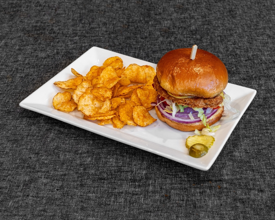 Brioche bun, vegan Chao cheese, vegan mayo, shredded lettuce, tomato, red onion, pickles