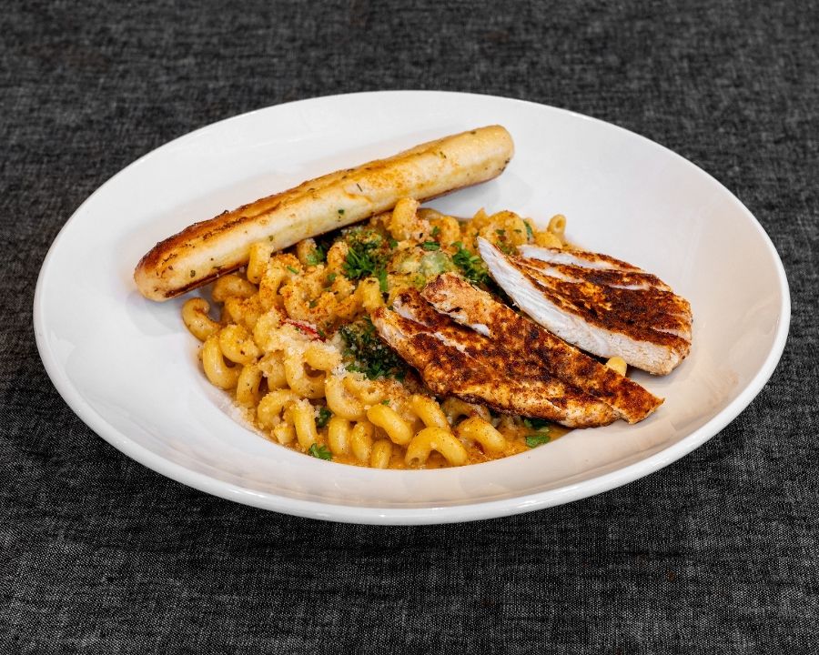 Cajun chicken breast, cavatappi noodles, house-made bourbon cream sauce, roasted red peppers, peas, broccoli, breadstick