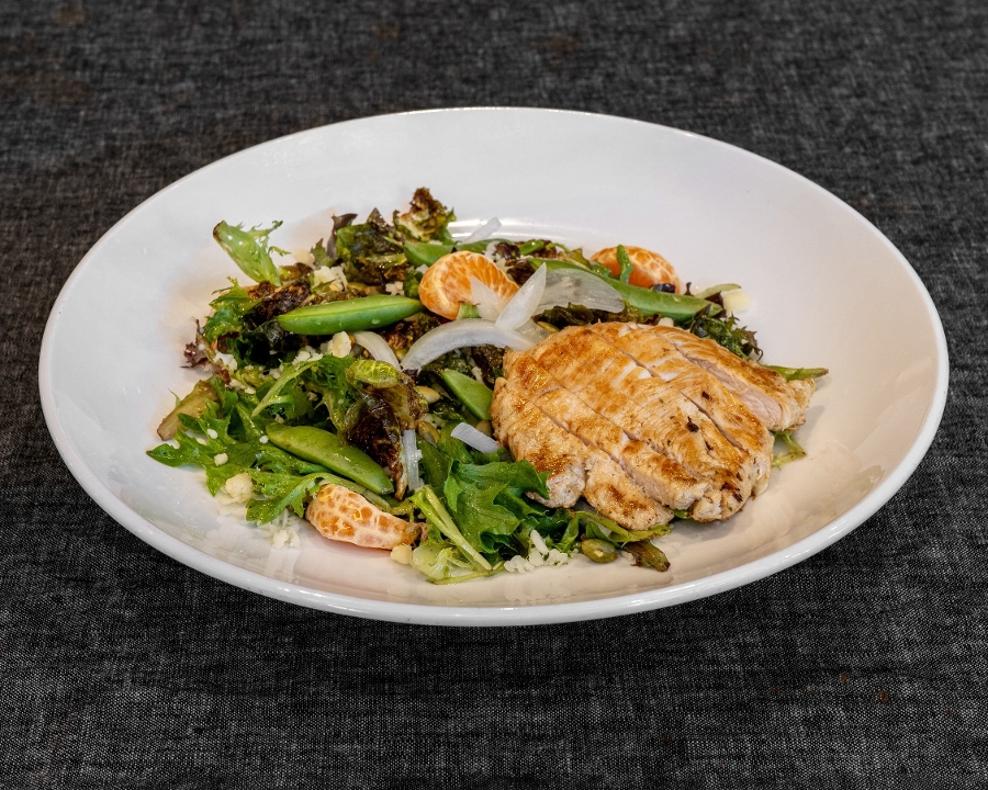 Chicken or sliced steak, spring mix tossed in an apple cider vinaigrette, orange slices, crispy Brussel sprout leaves, shredded white cheddar, snap peas, white onion, pumpkin seeds