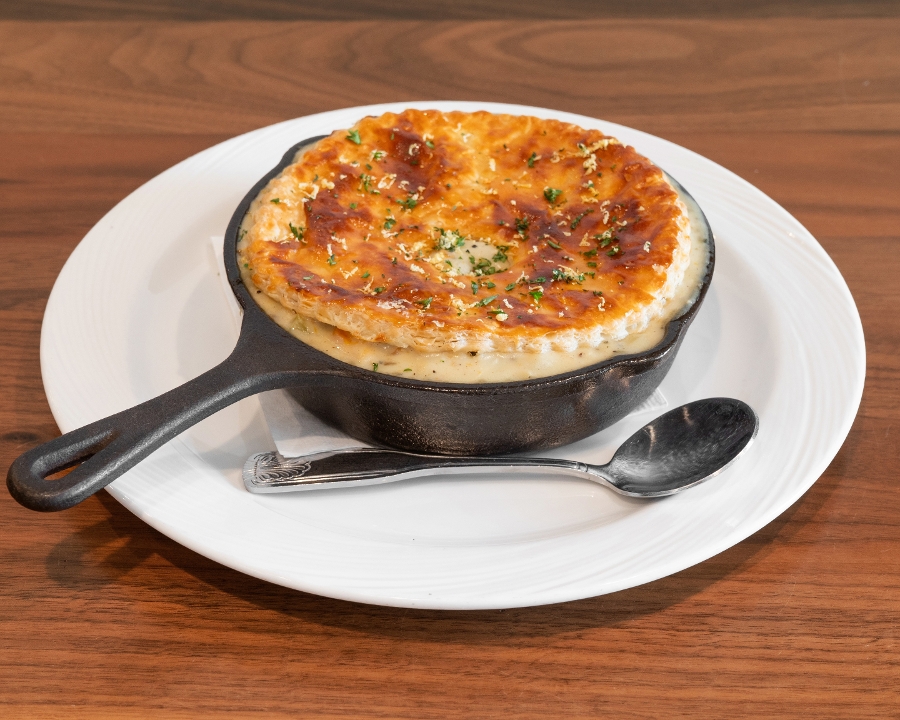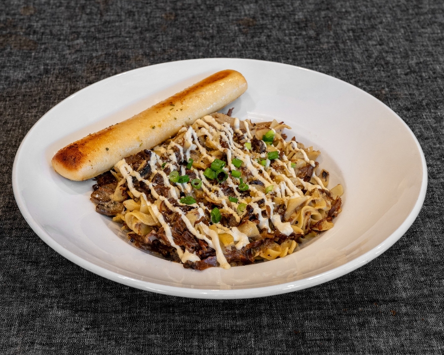 House-smoked roast, beef au jus, parmesan cream, egg noodles, mushrooms, white onion, dijon cream, green onion, breadstick
