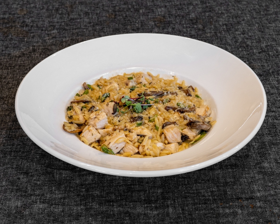 Grilled chicken, orzo, mushrooms, asparagus, peas, shallots, garlic, creamy marsala sauce