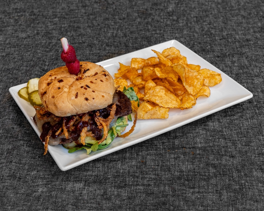 Two beef smash patties, Havarti cheese, arugula, crispy onions, garlic aioli, housemade raspberry BBQ, onion bun