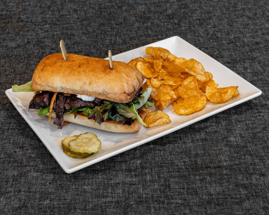 Sliced New York strip, boursin cheese, spring mix, bacon jam, red wine gastrique, crispy shallots, ciabatta bun