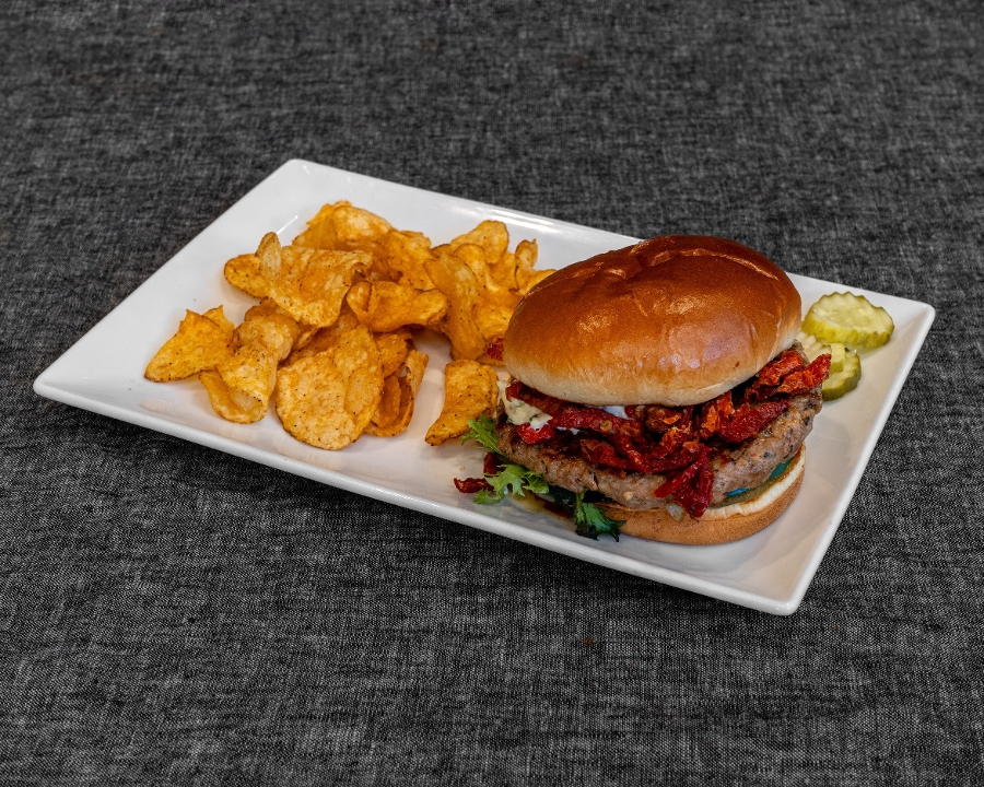 House-made turkey patty, chive, onion cream cheese, spring mix, lemon dill, cucumber, sauted sundried tomatoes