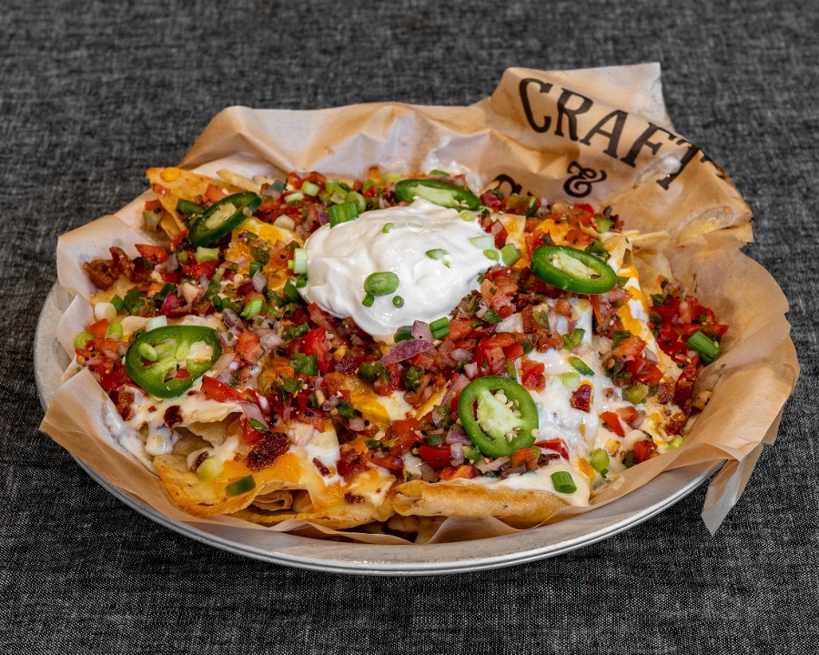 Choice of tater tots or corn chips with queso, cheddar, bacon, fresh jalapeño, green onion, pico, sour cream