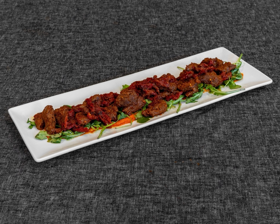 Guajillo glazed steak bites, romesco spread, arugula, chive oil, sundried tomatoes